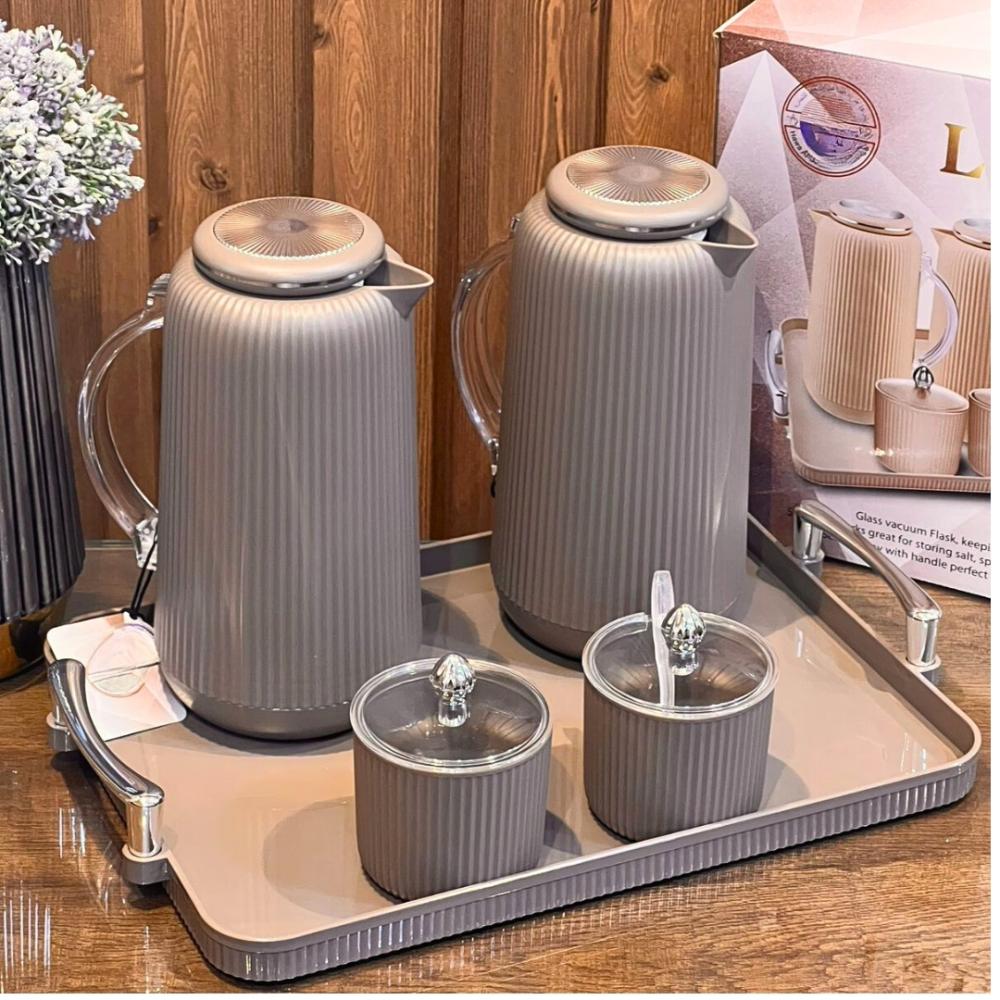 طقم تقديم فاخر يجمع بين الأناقة والفخامة في كل تفاصيله، مصمم خصيصًا ليضفي لمسة من الرقي على ضيافتك. يتكون الطقم من إبريقين حراريين على الغطاء، يضمنان الحفاظ على حرارة المشروبات لساعات طويلة، سواء كانت قهوة عربية أو شاي أو أي مشروب ساخن آخر. تأتي الإباريق بتصميم عصري بخطوط طولية تضيف لمسة جمالية فريدة، مع مقابض شفافة تمنحك سهولة في الحمل والتحكم.