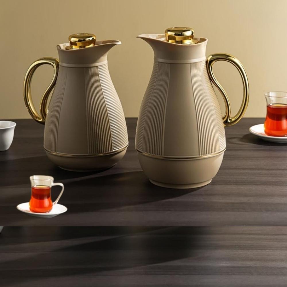 مما يسهل عملية السكب دون عناء. التصميم الخارجي مزخرف بخطوط ناعمة تضيف لمسة جمالية للطقم،