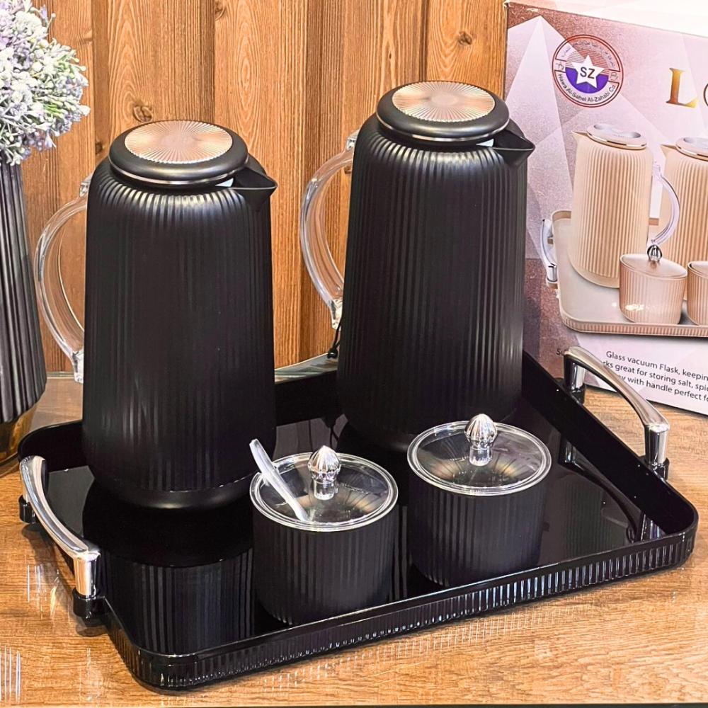 طقم تقديم فاخر يجمع بين الأناقة والفخامة في كل تفاصيله، مصمم خصيصًا ليضفي لمسة من الرقي على ضيافتك. يتكون الطقم من إبريقين حراريين مع لمسات فضية أنيقة على الغطاء، يضمنان الحفاظ على حرارة المشروبات لساعات طويلة، سواء كانت قهوة عربية أو شاي أو أي مشروب ساخن آخر. تأتي الإباريق بتصميم عصري بخطوط طولية تضيف لمسة جمالية فريدة، مع مقابض شفافة تمنحك سهولة في الحمل والتحكم.