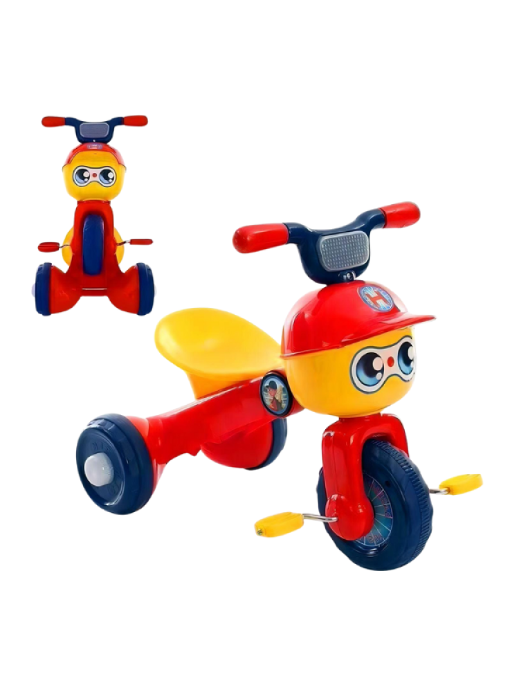 دراجة ثلاثية العجلات مخصصة للأطفال، بتصميم كرتوني جذاب وملون.