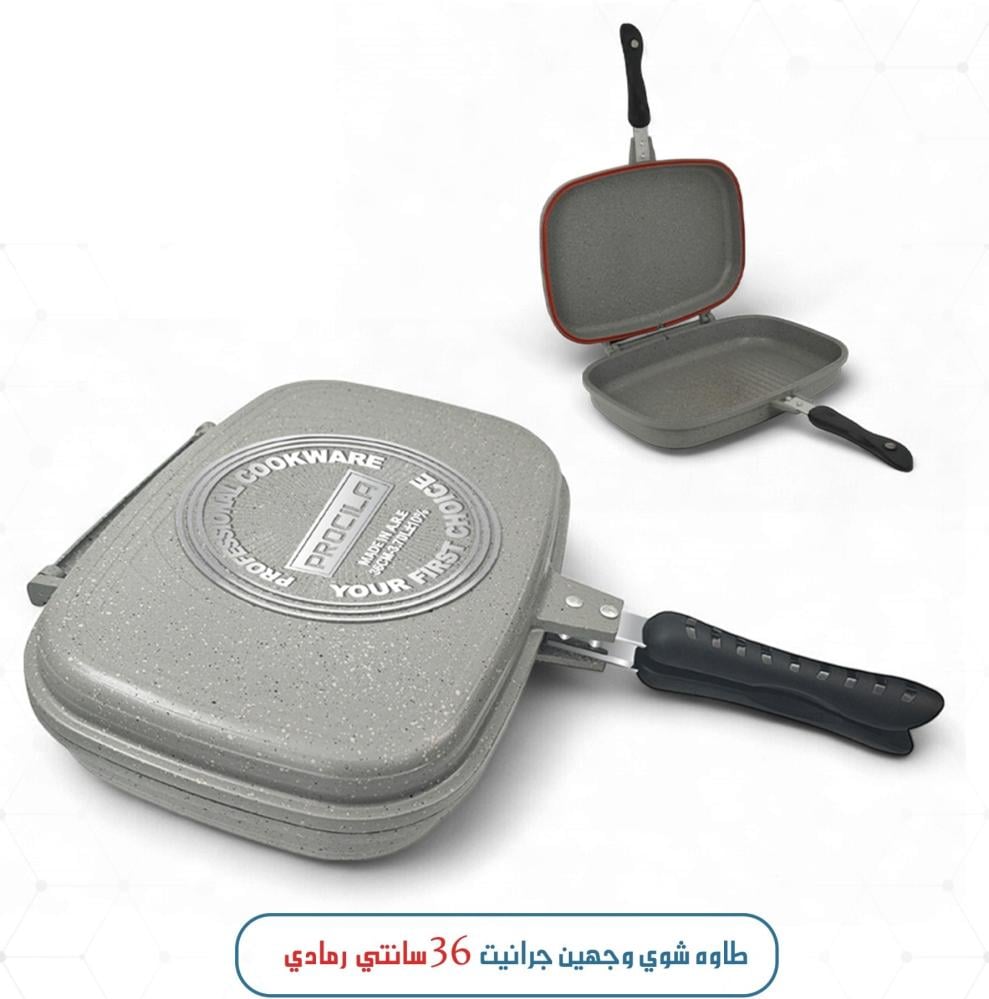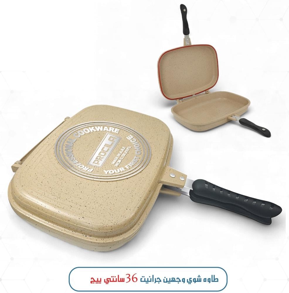 طاوه شواية جرانيت بقطر 36 سم بلون بيج، بتصميم وجهين متعدد الاستخدامات للشوي والتحمير من الجهتين بسهولة. مصنوع بطبقة غير لاصقة عالية الجودة لضمان طهي صحي وتنظيف سهل. مثالي للمطبخ العصري ويوفر نتائج طهي متساوية وشهية.