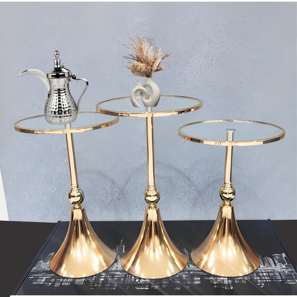 طقم طاولات تقديم عصريه تصنع لكِ مساحة مميزة في منزلكِ ذات تفاصيل لافتة للأنظار تعزّز من جمال أي مكان توضع فيه، مكونه من عامود من الاستيل الذهبي وسطح زجاجي .وقاعدة ذهبية ثابنة