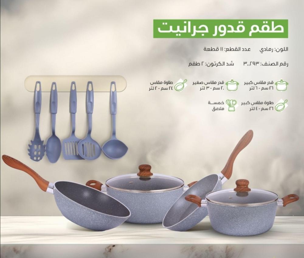 طقم قدور جرانيت عالي الجودة يتميز بطبقة داخلية غير لاصقة تضمن طهي صحي وسهل التنظيف. مقاوم للخدوش والتآكل ويوزع الحرارة بشكل متساوٍ، مثالي لجميع أنواع الطهي ويوفر أداء متميز مع تصميم أنيق وعصري يناسب كل المطابخ.