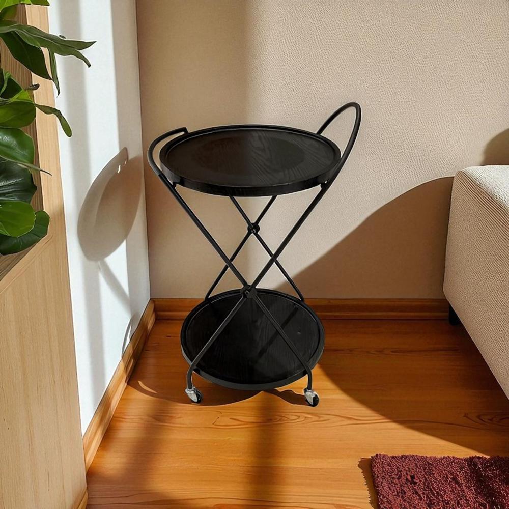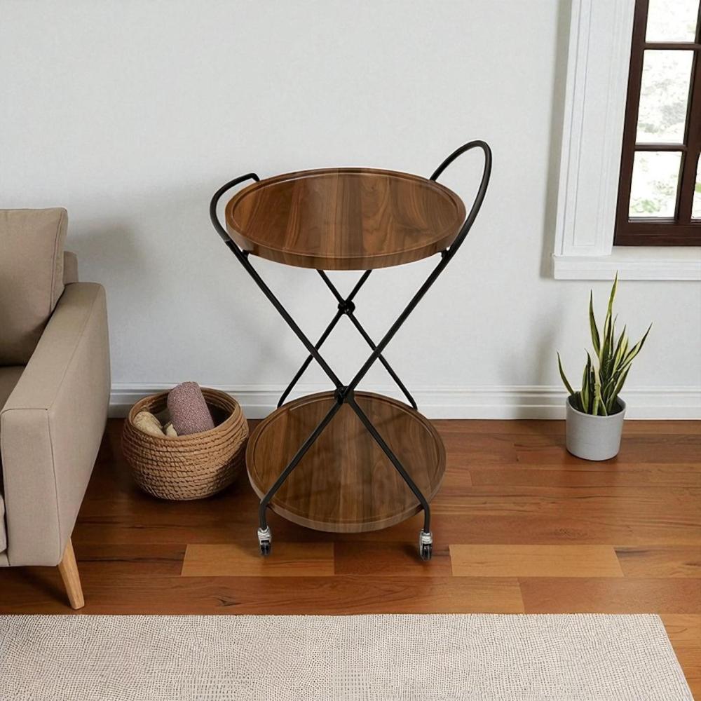 أضف لمسة فخامة إلى ضيافتك مع هذا الترولي الدائري الأنيق، المصنوع من خشب طبيعي فاخر وإطار معدني أسود متقاطع يمنحه ثباتاً وأناقة لا مثيل لها. تصميمه العملي بعجلتين يسهل نقله في أرجاء المنزل، سواءً أثناء تقديم المشروبات أو كقطعة ديكور أنيقة في غرفة المعيشة.
