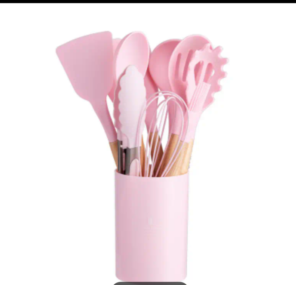 تتظمن عشر قطع من ادوات الطبخ في مجموعة واحدة وتاتي مع وعاء حامل للقطع.
