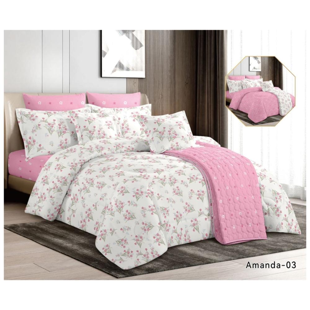 امنحي غرفة نومك لمسة من الأناقة والنعومة مع طقم اللحاف Amanda-03، بتصميم أنثوي مميز يمزج بين الألوان الحالمة والزهور الرقيقة.